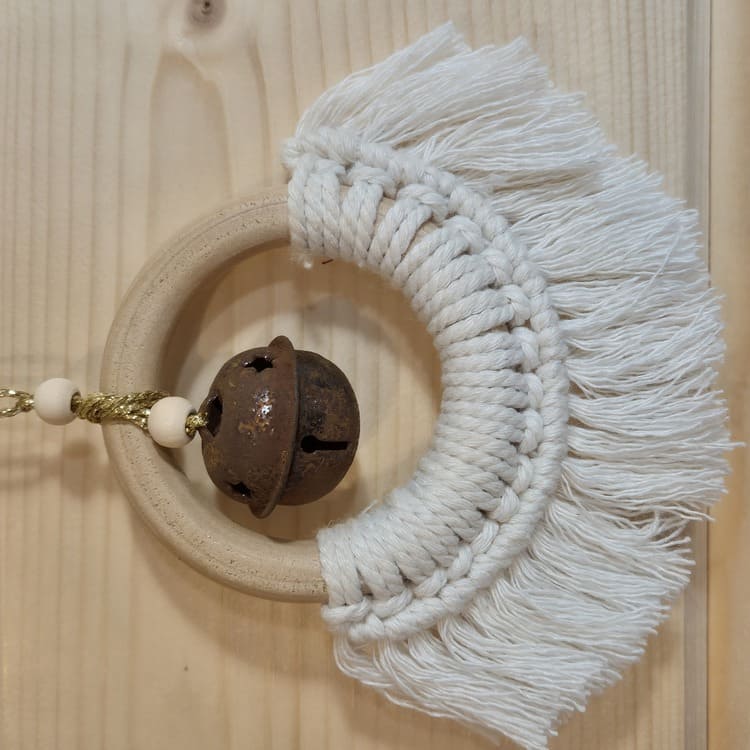 Matière : Anneau en bois naturel, cordons en coton naturel ou lin, selon modèle, décors en argile, grelot métal vieilli