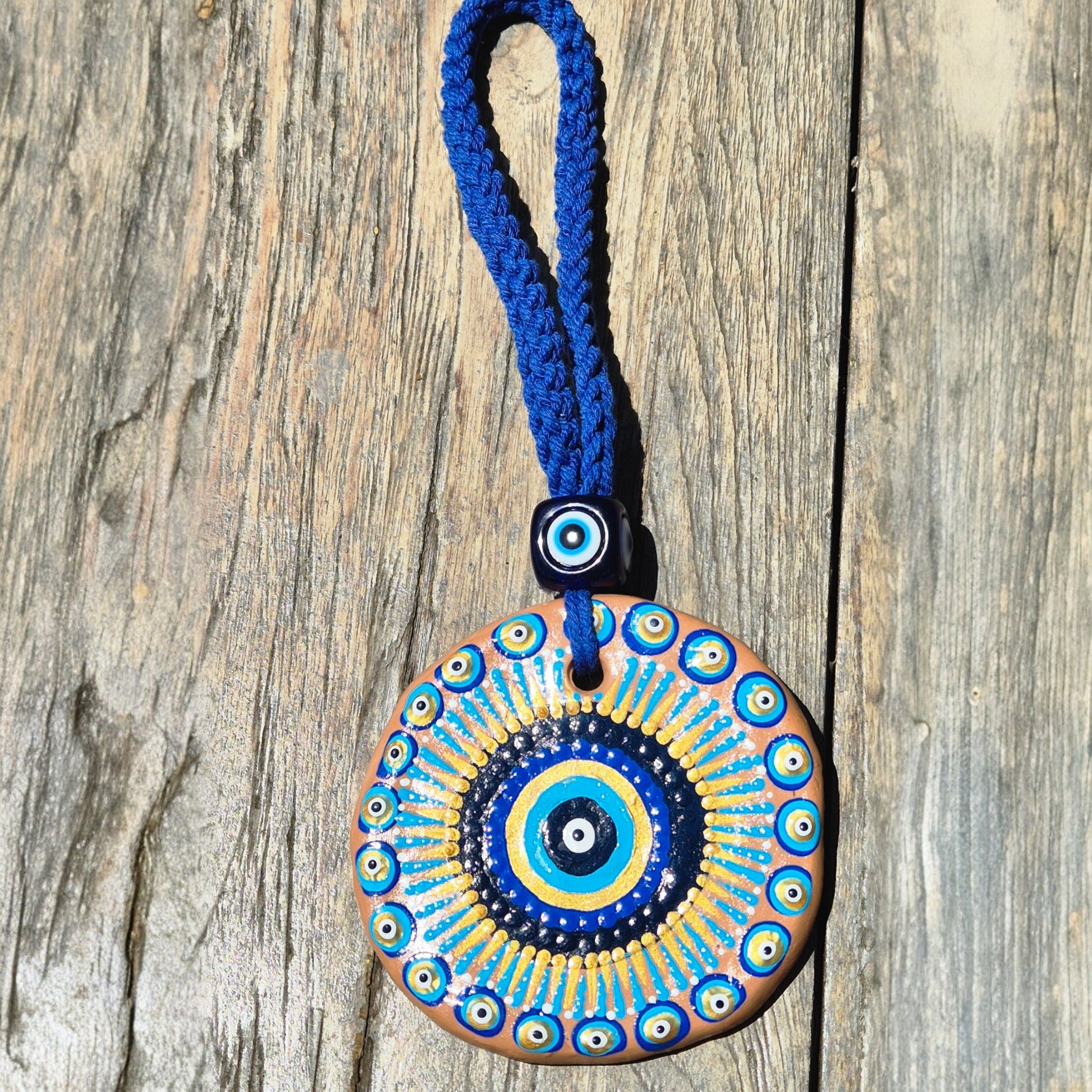 Puissant symbole de protection, le pendentif « Cercle Infini » concentre une ronde d’yeux protecteurs peints à la main. Le bleu profond et l’or se mêlent pour créer un cercle infini, rappelant la continuité de la protection et de la bonne énergie.