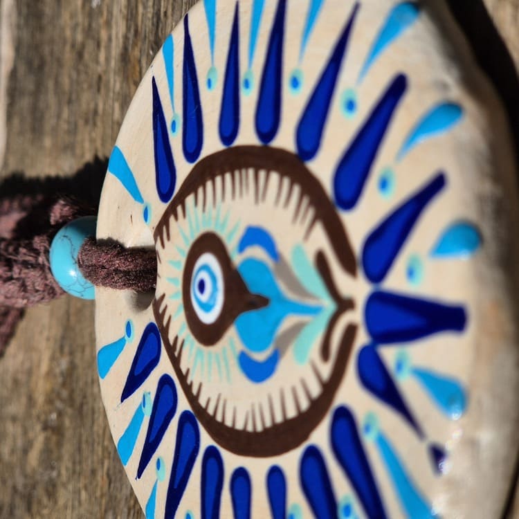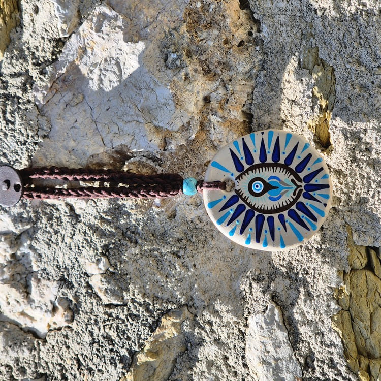 Apportez une touche d'énergie et de protection à votre intérieur avec ce porte bonheur confectionné à la main. Cette pièce est modelée en argile, peinte avec soin et suspendue par un cordon réalisé au crochet, orné d'une perle oeil protecteur.