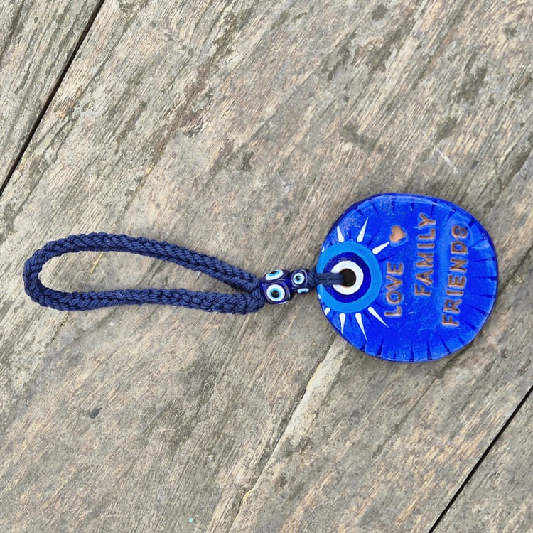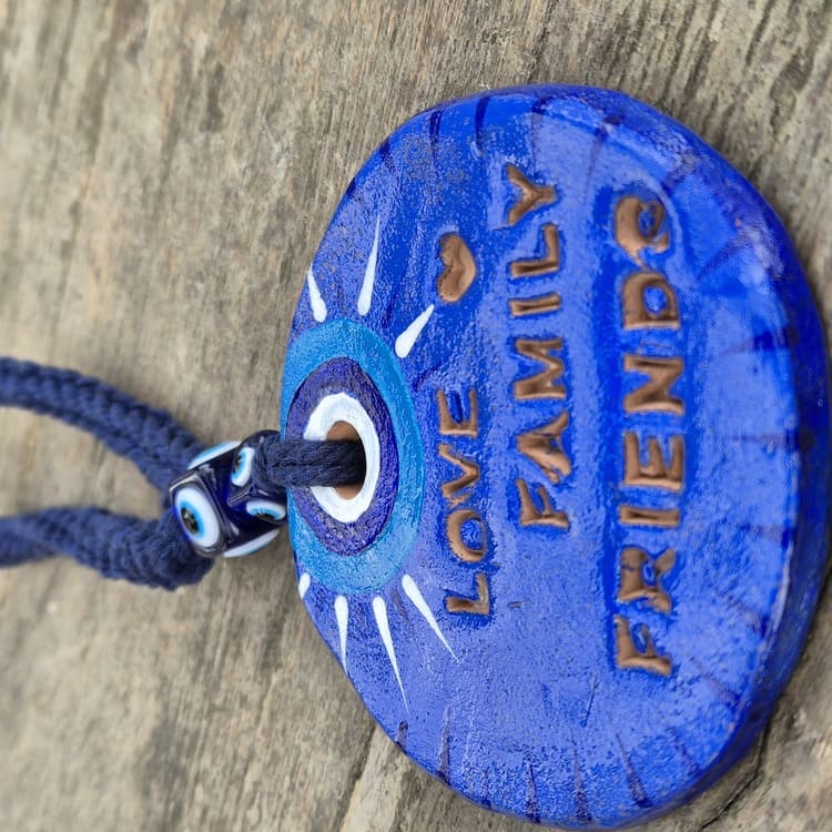 Apportez une touche de couleur, d'énergie et de protection à votre intérieur avec ce porte bonheur confectionné à la main. Cette pièce est modelée en argile, peinte avec soin et suspendue par un cordon réalisé au crochet, orné d'une perle oeil protecteur.