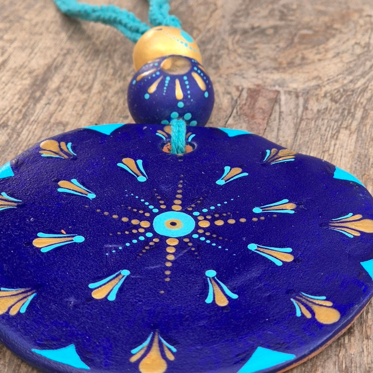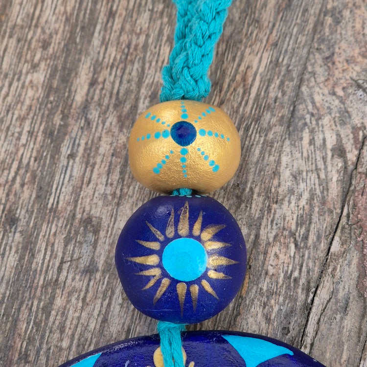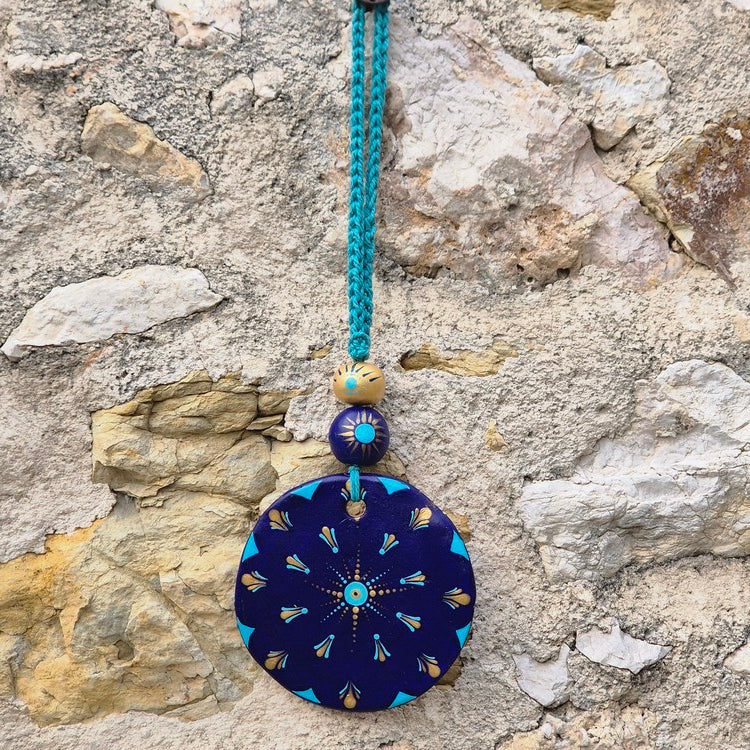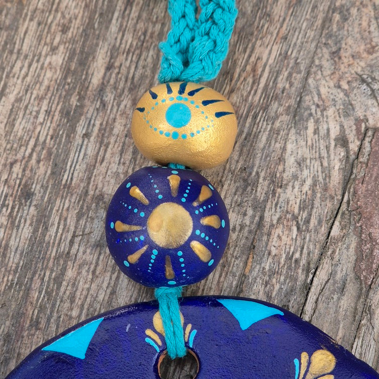 Apportez une touche de douceur, de couleur et de protection à votre intérieur avec ce porte bonheur confectionné à la main. Cette pièce est modelée en argile, peinte avec soin et suspendue par un cordon réalisé au crochet, orné de perles.
