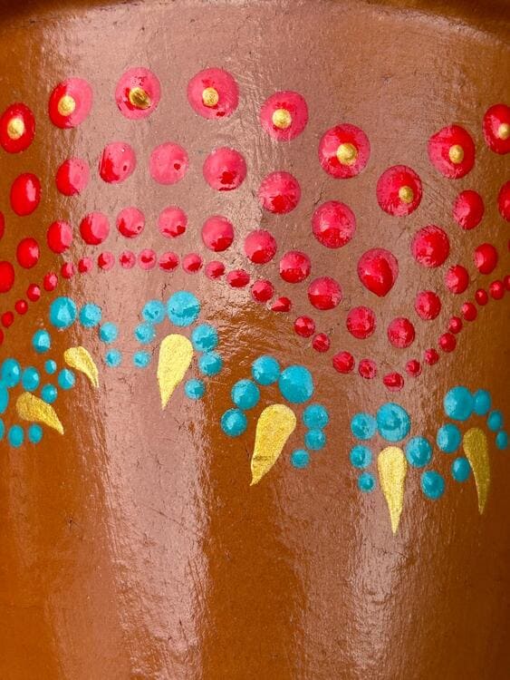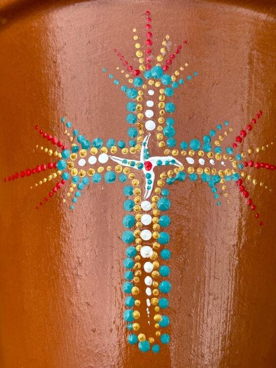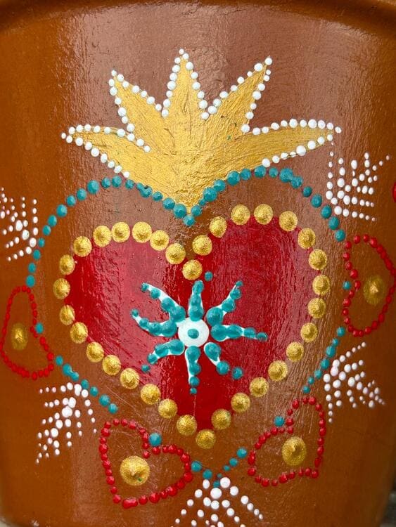 Ce cache pot et sa soucoupe en terre cuite sont entièrement peints à la main avec des motifs inspirés de l’art populaire et du symbolisme du cœur sacré. Chaque détail, chaque point de couleur est apposé avec soin pour transformer ce pot en une pièce unique, vibrante et pleine d’âme.