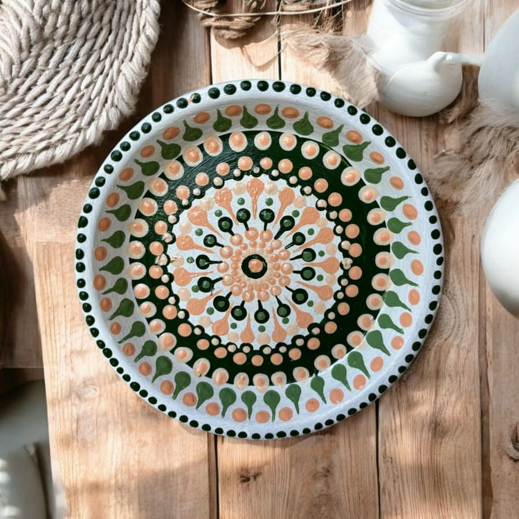 Cette pièce unique a été peinte à la main avec amour dans une palette végétale et douce : vert profond, pêche pastel et blanc cassé. Les motifs en dot painting évoquent des cœurs sacrés, des feuillages stylisés et une harmonie paisible qui réchauffe tout intérieur.